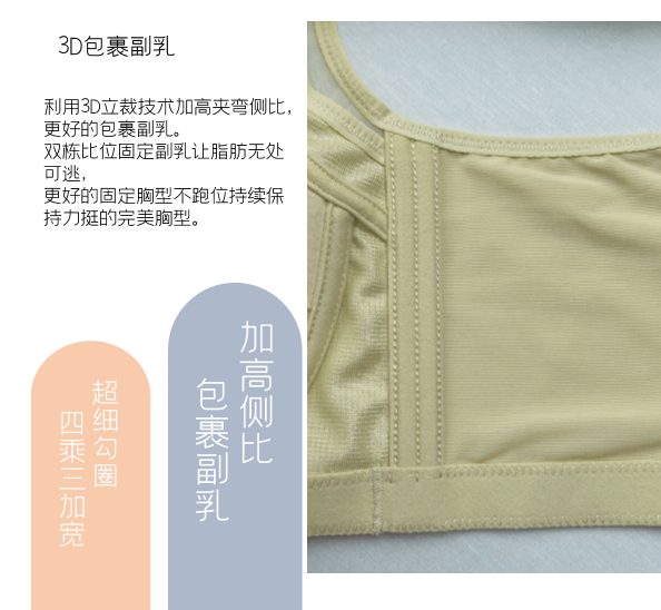 加高的高侧比与双胶骨相结合,能完美包裹副乳的同时,还能侧收腋下多于脂肪至罩杯内,轻松锁定游离脂肪。