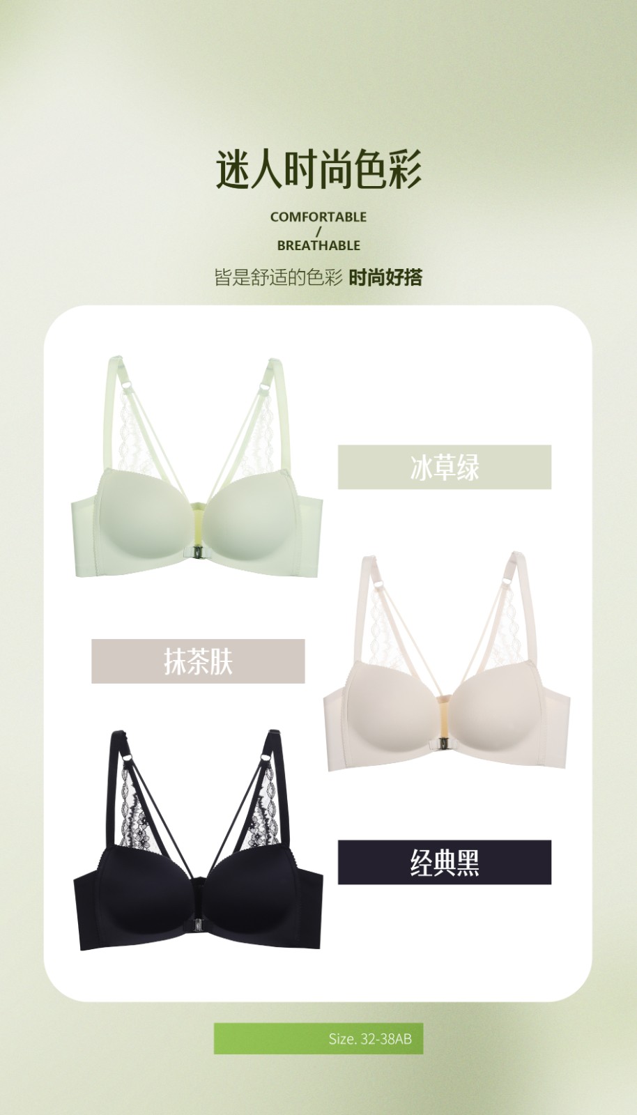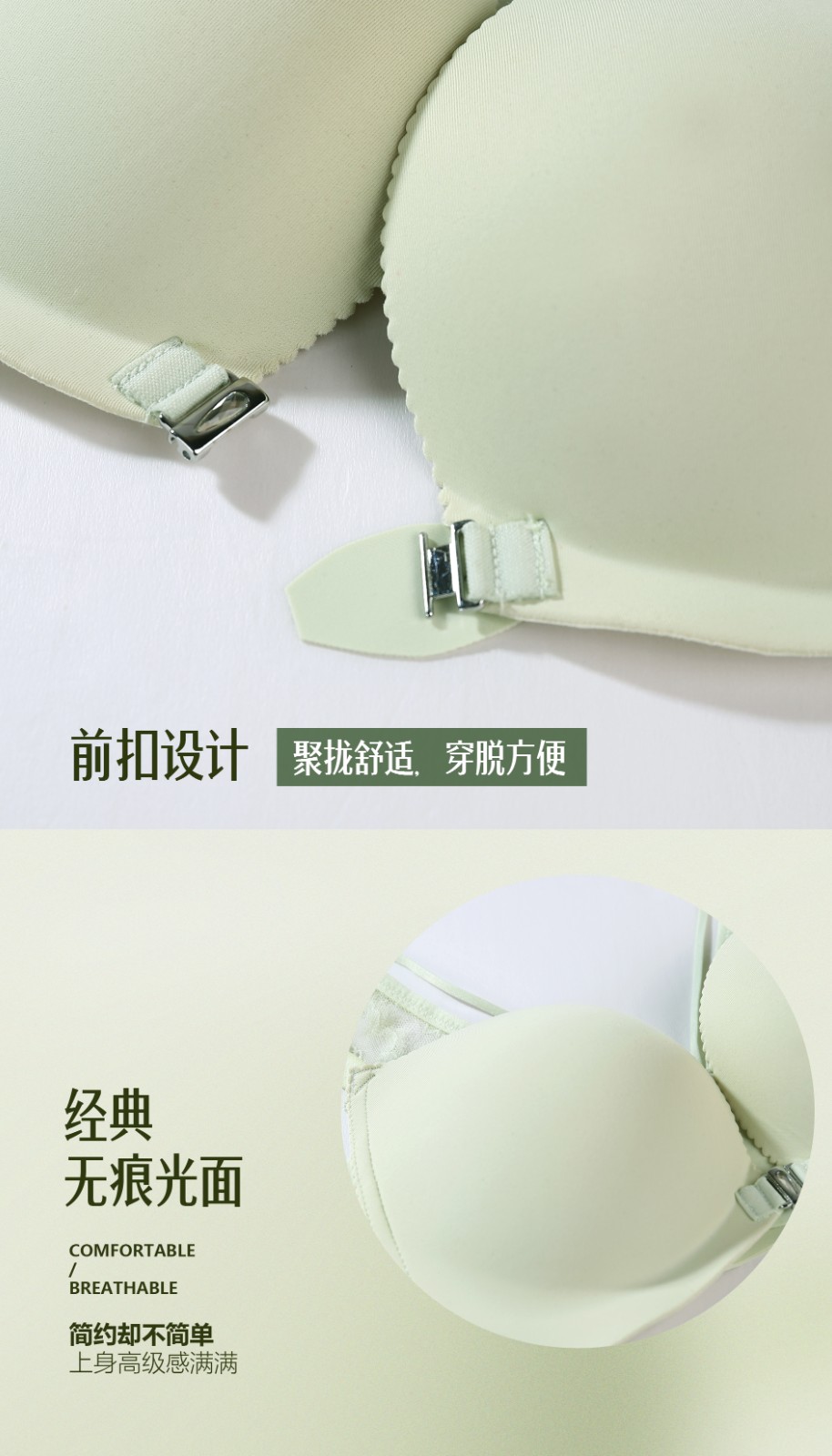 2.前扣设计,聚拢舒适,穿脱方便,远离反手搭背扣的繁琐问题;