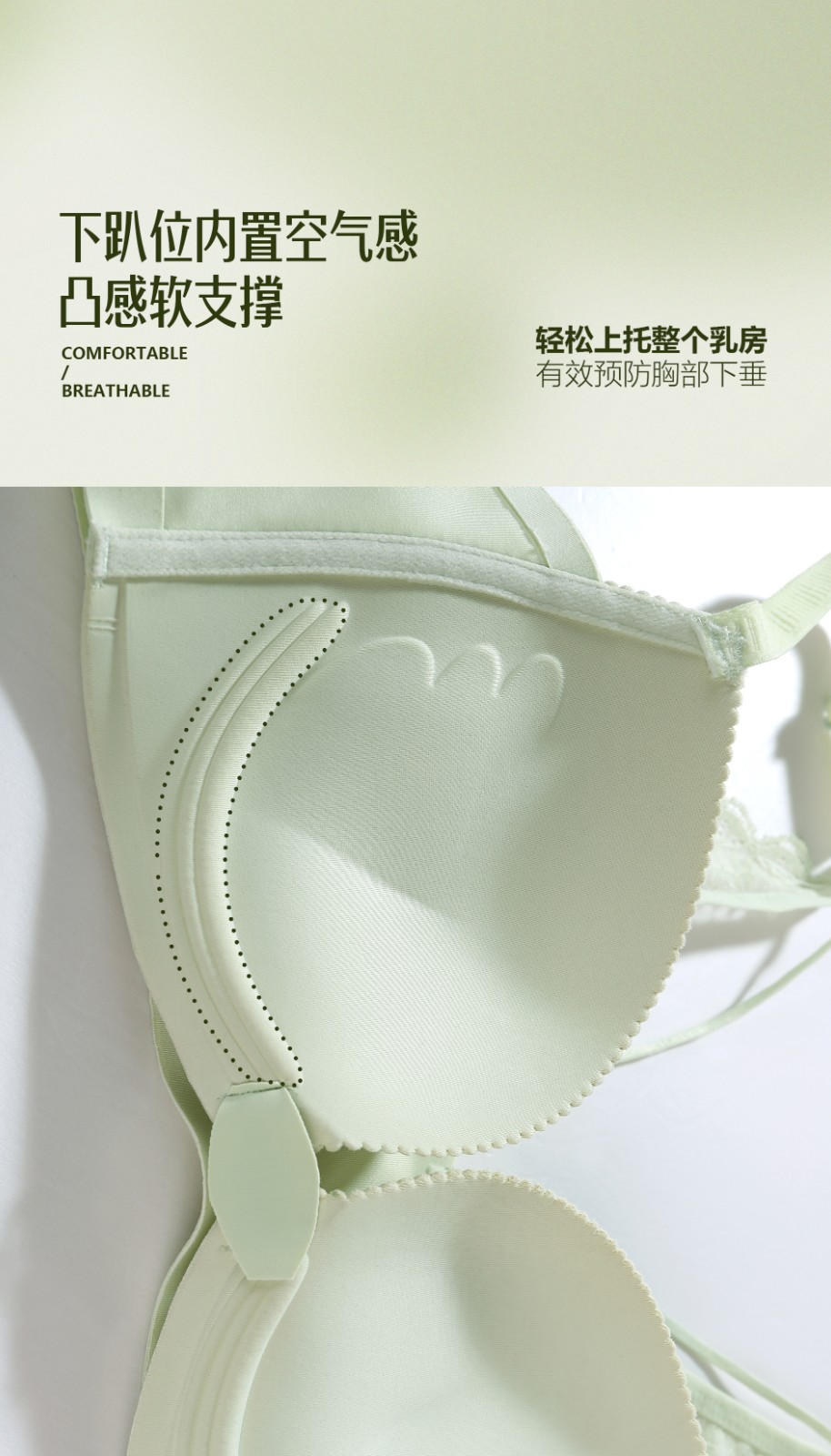 3.下趴位内置空气感凸感软支撑,轻松上托整个乳房,有效预防胸部下垂;