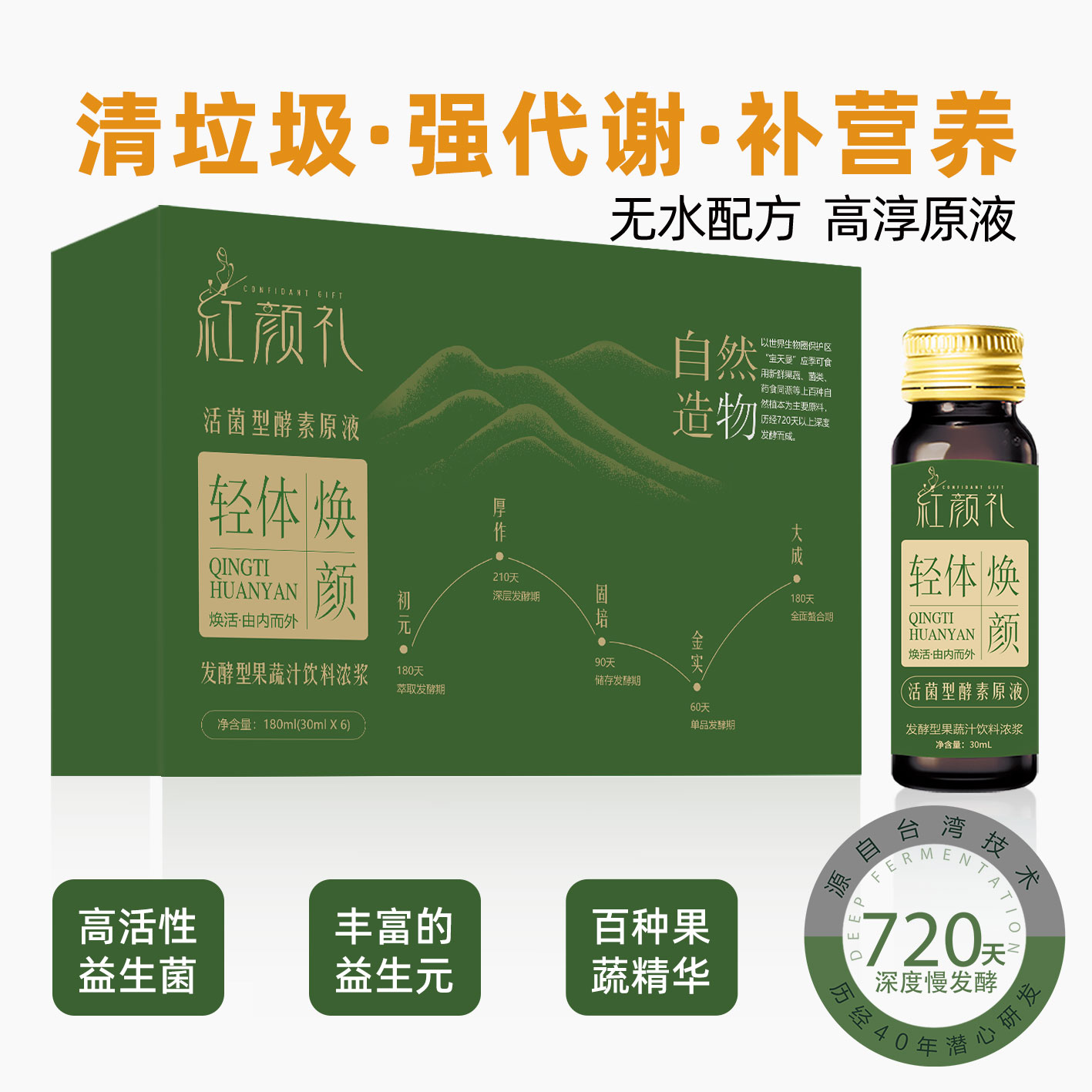 呵护肠道健康,净化内在环境,调养身体代谢,补充珍稀营养,720天活菌慢发酵,富含益生菌益生元,0防腐剂,0致泻成分添加,安全自然,长期饮用无负担。